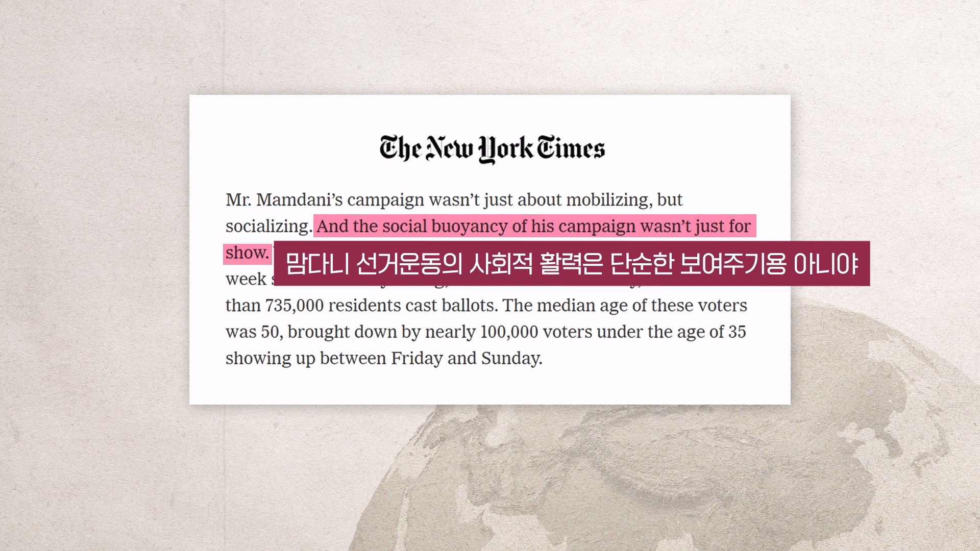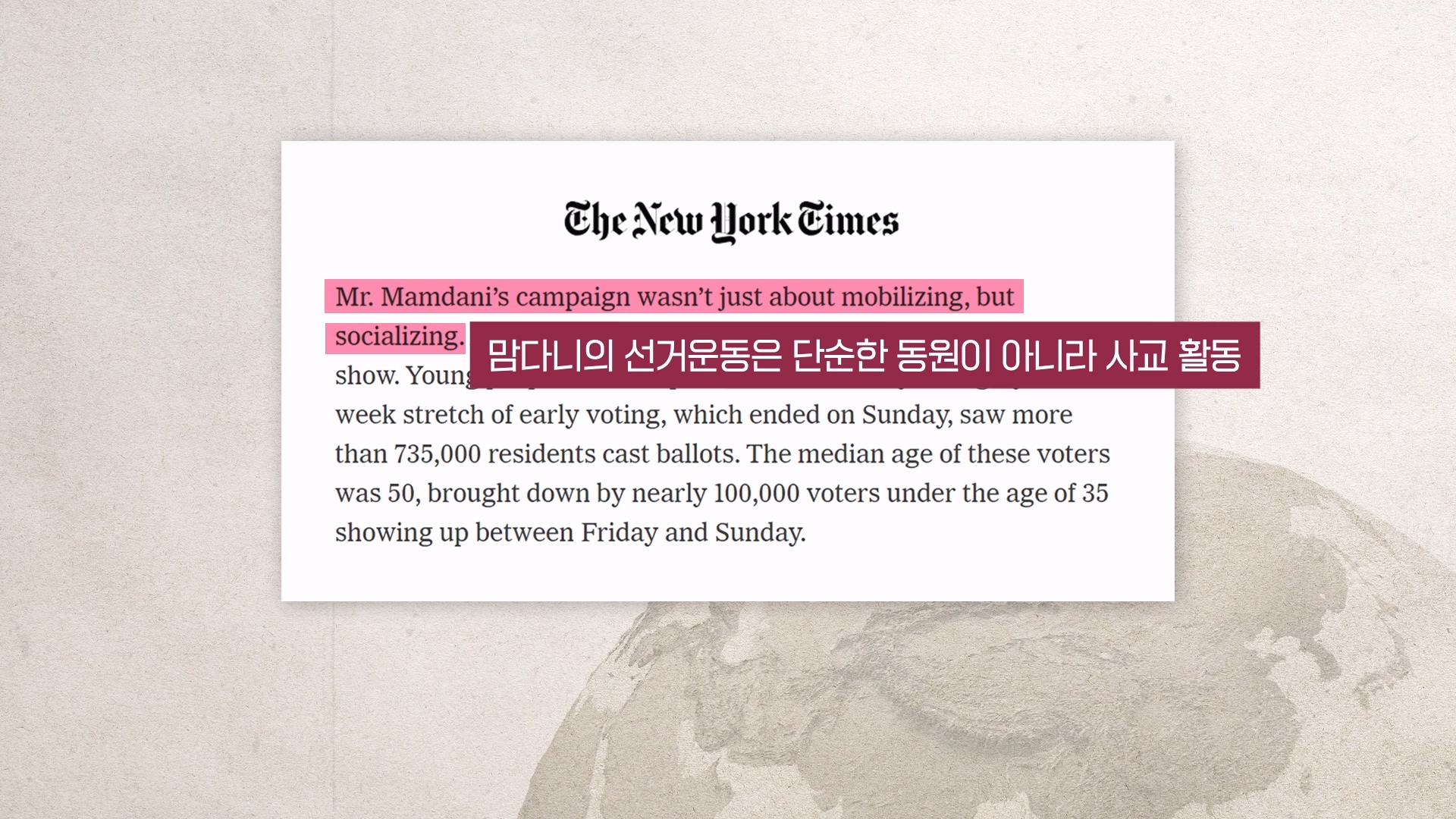 뉴욕타임스는 맘다니 당선인의 선거 운동이 단순한 동원이 아니라 사교 활동에 관한 것이었다면서 그의 선거 운동에 이런 사회적인 활력이 단순히 보여주기용이 아니었다라고 분석을 했습니다. 이른바 '외로운 세대'라고 불리는 젊은 층의 지지율과 투표율을 실제로 끌어올린 요인이 됐다는 겁니다.