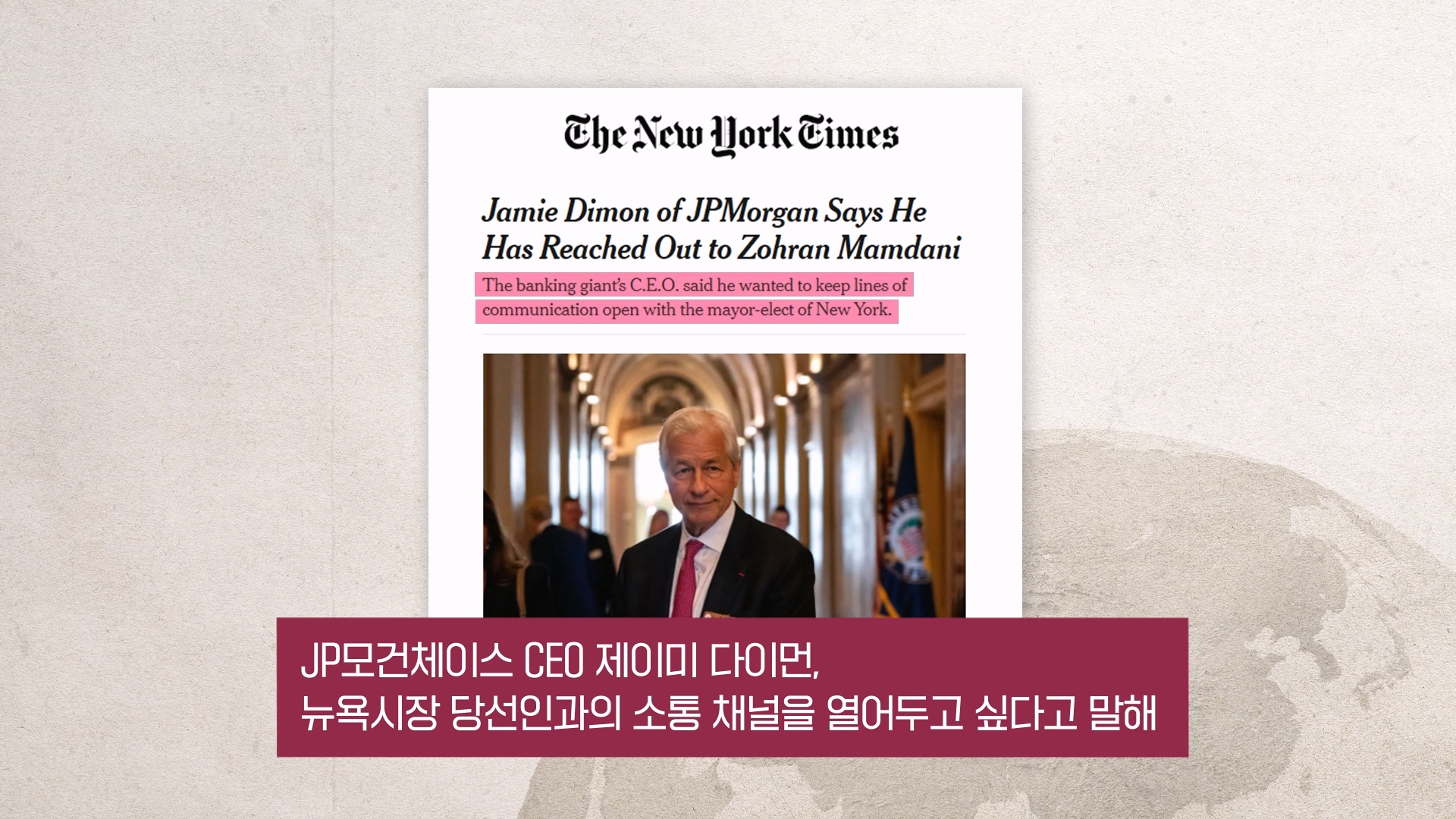 반면 한때 맘다니 당선인을 마르크스주의자라고 칭했던 JP모건체이스의 최고 경영자는요. 맘다니 당선인의 당선 직후, 뉴욕시장 당선인과의 소통 채널을 열어두고 싶다고 말했습니다.