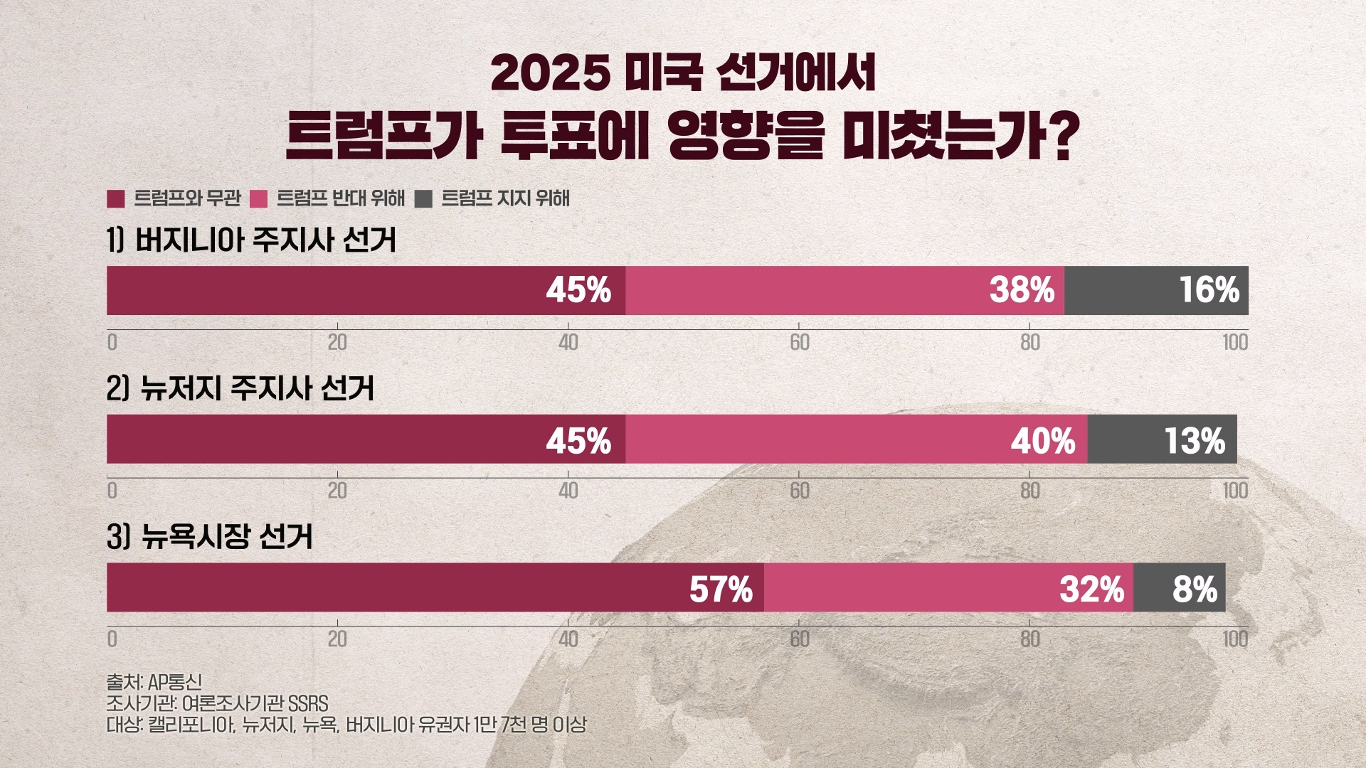 AP가 해당 지역 유권자 약 1만 7천 명을 대상으로 실시한 조사에 따르면요. 버지니아주와 뉴저지주에서는 절반에 약간 못 미치는 45%의 유권자들이 트럼프 대통령이 주지사 선거에서 영향력이 없었다고 답했습니다. 실제로 월요일 밤 SNS 게시물과 또 전화 유세를 제외하면 트럼프 대통령은 해당 주의 공화당 후보들에게 별다른 직접적인 도움을 주지는 않았습니다. 뉴욕시장 선거 유권자 10명 중 약 6명, 57%도 트럼프 대통령이 선거 결과에 영향을 미치지 않았다고 답했습니다.