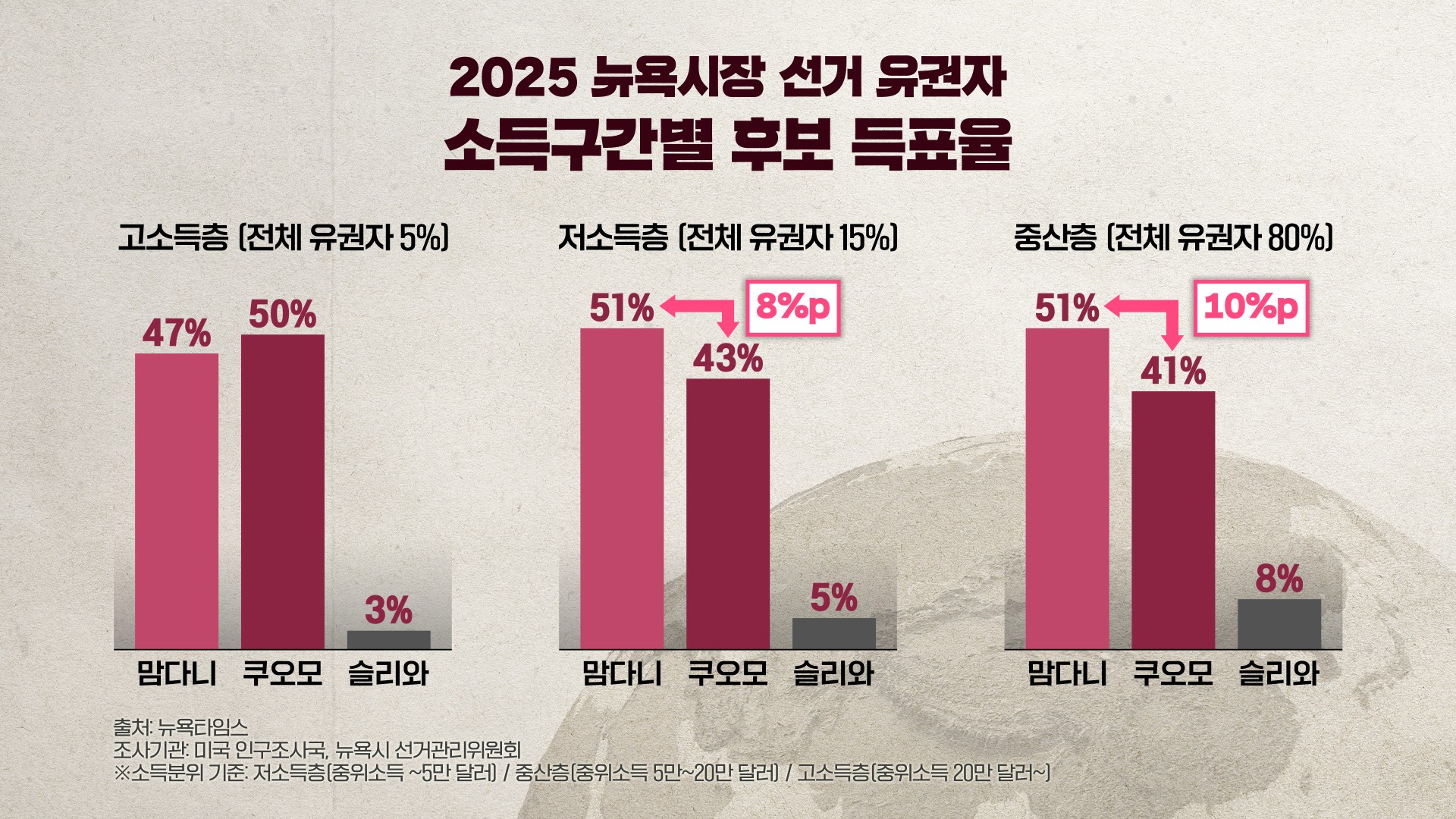 뉴욕타임스 보도에 따르면 이번 선거에서 전체 유권자의 15%를 차지하는 저소득층에서 맘다니 후보는 쿠오모 후보를 8%p 앞섰습니다. 또 유권자의 약 80%를 차지하는 중산층에서도 맘다니 후보가 10%p 우세한 걸로 조사가 됐습니다.