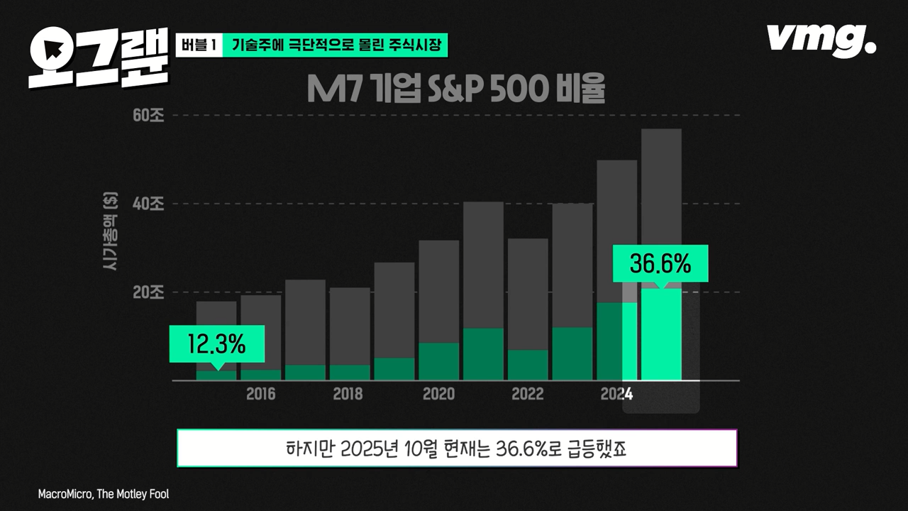 M7만 따로 놓고 보면 10년 전엔 7개 기업이 S&P500에서 차지하는 비율은 12.3%에 불과했습니다. 하지만 2025년 10월 현재에는 36.6%로 급등했죠.