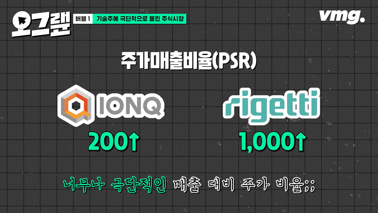 양자컴퓨터 관련주로 꼽히는 아이온큐와 리게티 컴퓨팅을 볼까요? 두 기업들의 매출 대비 주가 비율은 너무나 극단적입니다. 투자라는 것 자체가 미래의 전망을 바탕으로 진행되는 거지만, 지금 상황은 너무 극단적입니다.