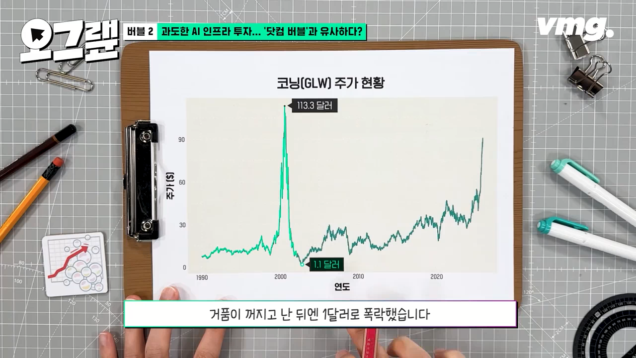 당시 세계 최대 광케이블 생산업체였던 코닝의 주가는 2000년에 100달러를 찍기도 했지만 거품이 꺼지고 난 뒤엔 1달러로 폭락했습니다. 참고로 코닝은 지금 AI 붐에 힘입어 데이터센터 내 광케이블 수요가 늘어나자 다시금 상승세를 타고 있어요.