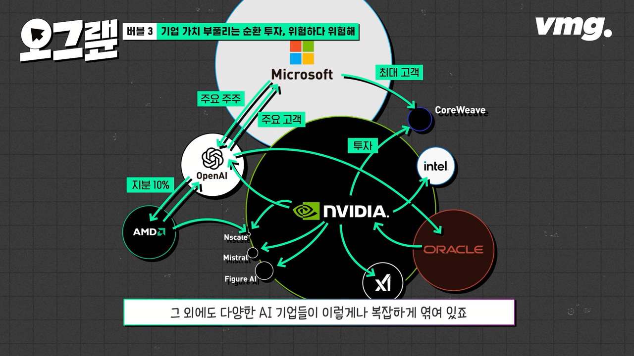 엔비디아와 오픈AI만 이런 관계에 있는 게 아닙니다. 오픈AI는 AMD와도 비슷한 계약을 체결했어요. AMD는 오픈AI의 지분 10%를 얻었고요. 오픈AI는 마이크로소프트와도 끈끈합니다. 마이크로소프트는 오픈AI의 주요 주주이고, 오픈AI는 마이크로소프트의 클라우드 애저의 주요 고객입니다. 또 마이크로소프트는 AI 클라우드 기업인 코어위브의 최대 고객인데, 이 코어위브는 엔비디아가 지분 5%를 갖고 있죠. 그 외에도 다양한 AI 기업들이 이렇게나 복잡하게 엮여 있습니다.