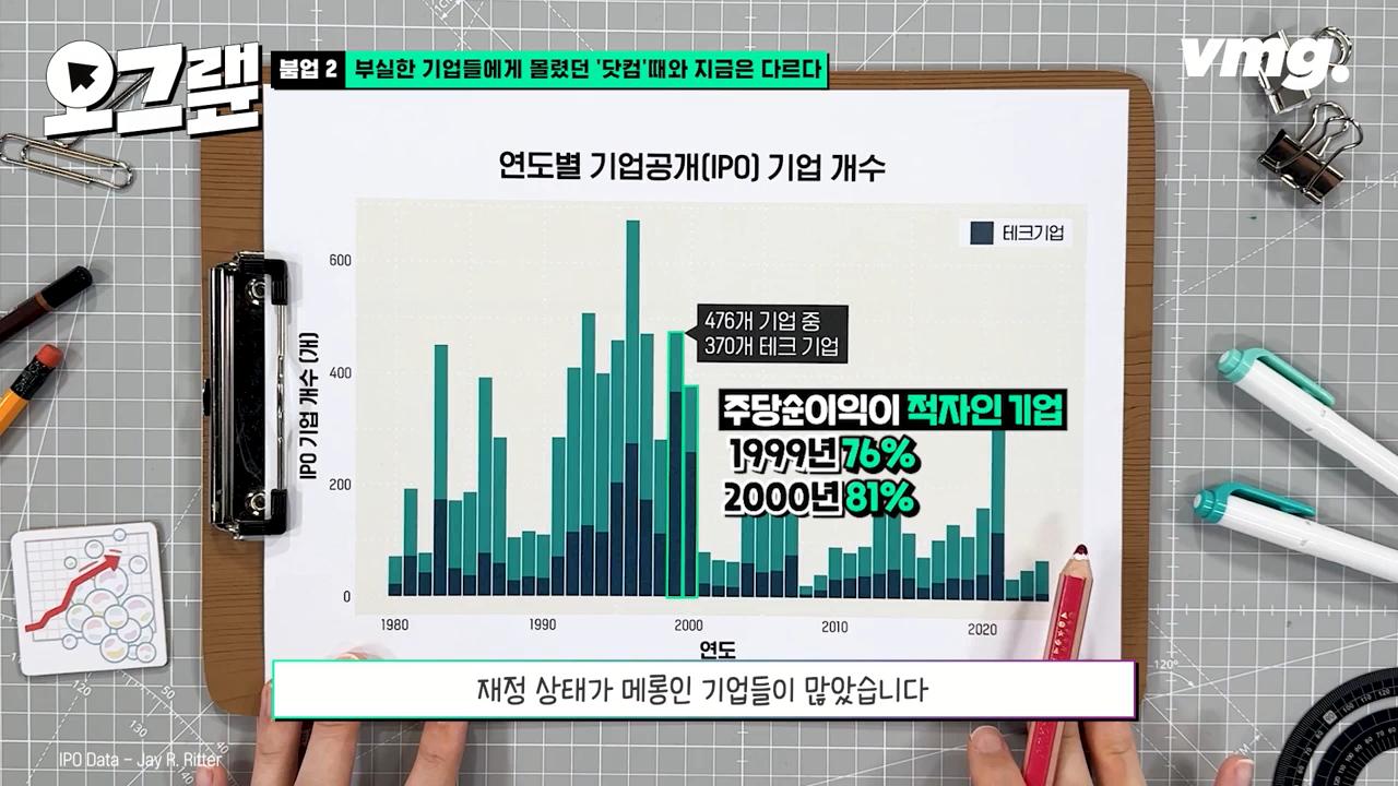 문제는 이때 당시 상장한 기업들의 재정 상태가 좋지 않았다는 겁니다. 476개 기업 가운데 주당순이익이 적자인 상태로 상장한 기업은 전체의 76%나 됐거든요. 2000년에는 그 비율이 81%까지 치솟을 정도로 재정 상태가 메롱인 기업들이 많았습니다.