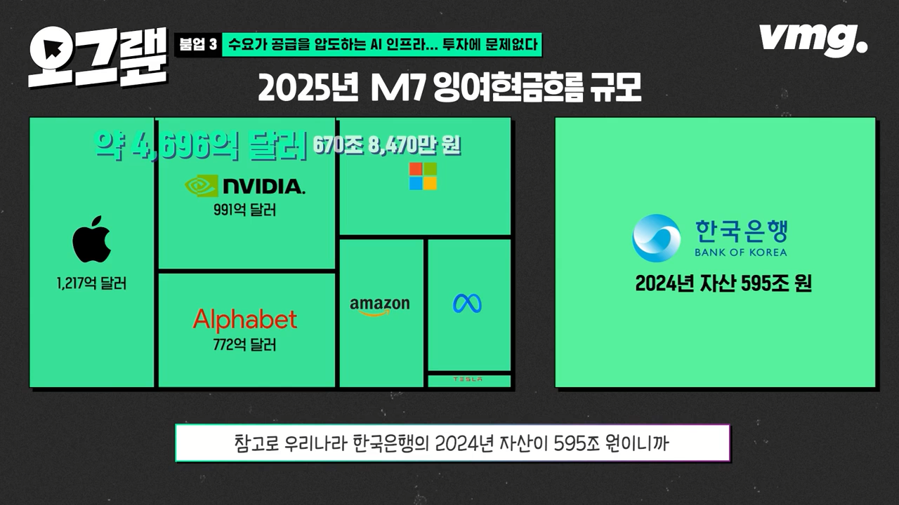 기업들이 벌어들인 금액에서 자신들이 운영하는 사업에 필요한 투자금을 뺀 진짜 남은 돈을 잉여현금흐름, FCF라고 합니다. 2025년 기준으로 M7 기업들의 진짜 남은 돈을 살펴보면 약 4,696억 달러로 집계됩니다. 우리나라 돈으로 계산하면 약 670조 원이 나오죠. 애플이 1,217억 달러로 가장 많고 엔비디아 991억, 구글 772억 등… 빅테크 기업들의 재무 상태는 상당히 건강합니다. 참고로 우리나라 한국은행의 2024년 자산이 595조 원이니까 얼마나 많은지 감이 오실 겁니다.