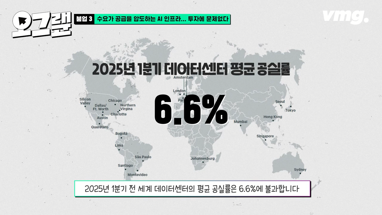 2025년 1분기 전 세계 데이터센터의 평균 공실률은 6.6%에 불과합니다. 가장 공실률이 낮은 지역은 북부 버지니아 지역인데 지난 1분기 공실률이 0.76%에 불과했습니다. 전 세계에 걸쳐서 데이터센터 수요가 공급을 계속 앞지르고 있는 겁니다.
