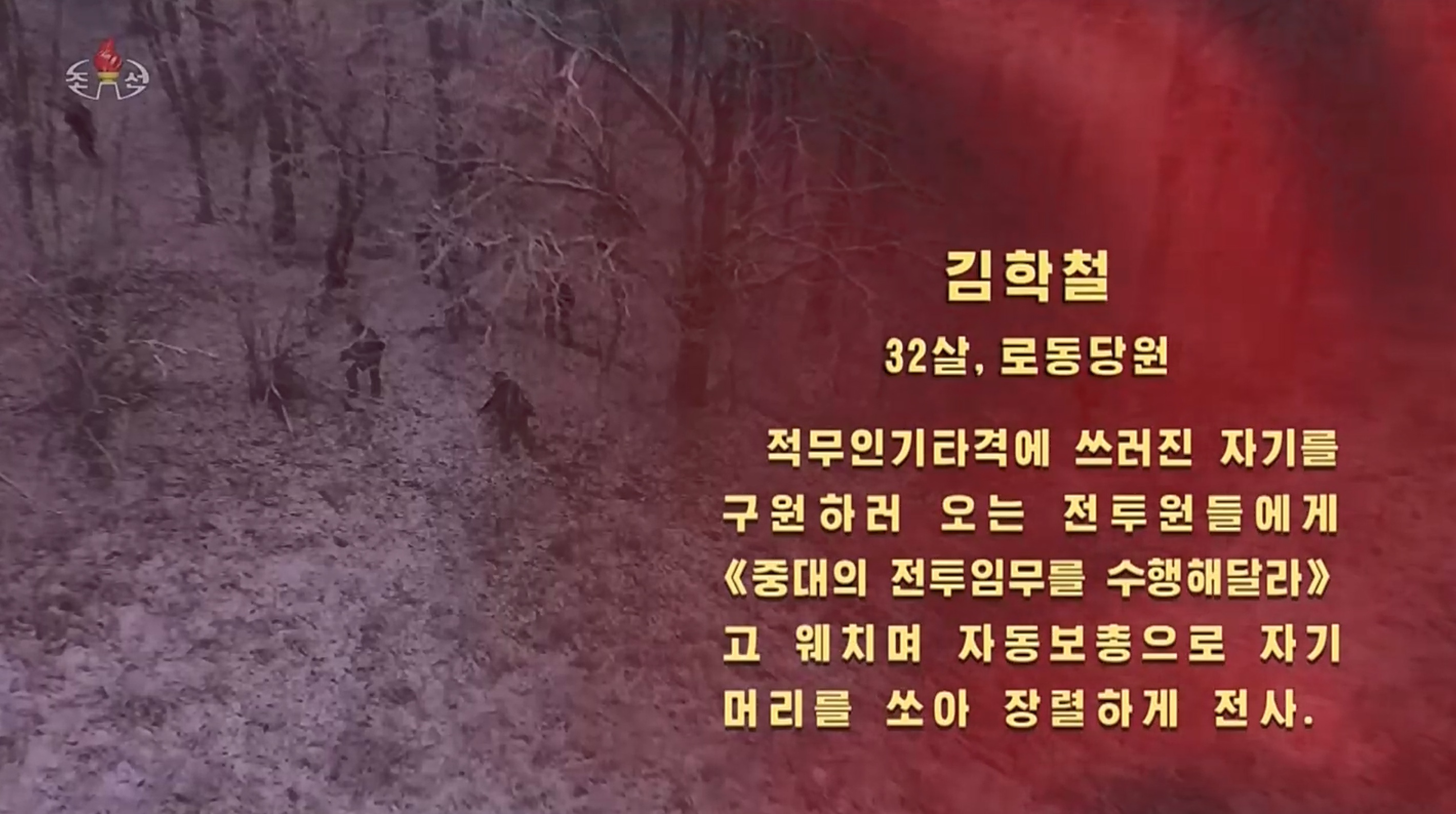 공연 영상물을 통해 소개된 북한군 사망경위, 지난 8월# 김학철 (32살, 노동당원) - 적 무인기 타격에 쓰러진 자기를 구원하러 오는 전투원들에게 <중대의 전투임무를 수행해달라>고 웨치며(외치며) 자동보총으로 자기 머리를 쏘아 장렬하게 전사