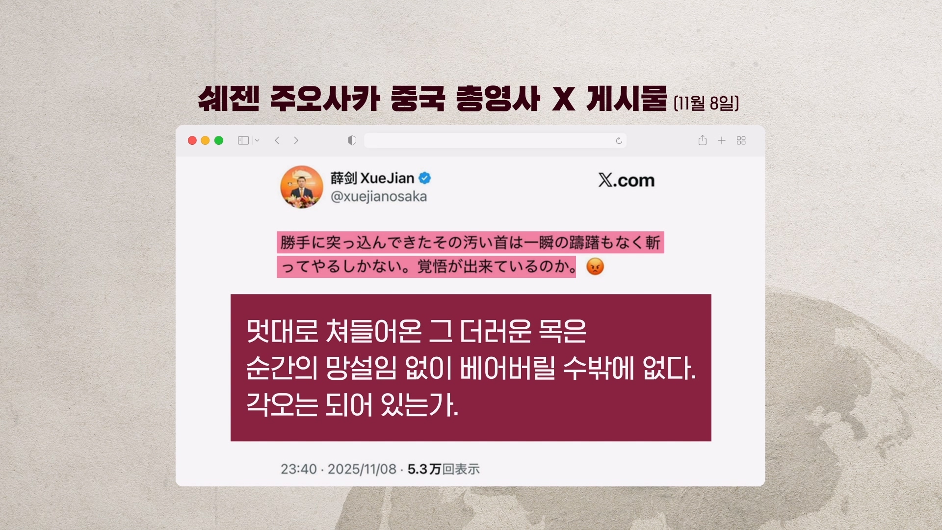 쉐젠이라는 주오사카 중국 총영사가 다카이치 총리에 대해서 '목을 벨 수밖에 없다'는 극언을 X에 올렸고 중국 관영 매체도 "무모하게 떠드는 소리다", "불을 피우는 자는 화상을 입는다"라고 하면서 가세했습니다.