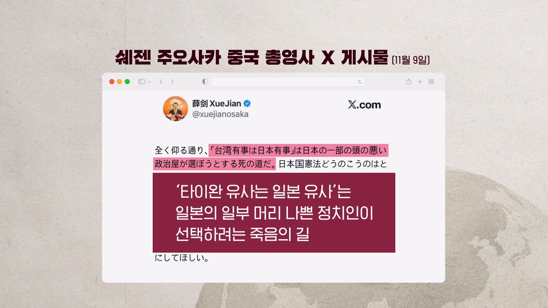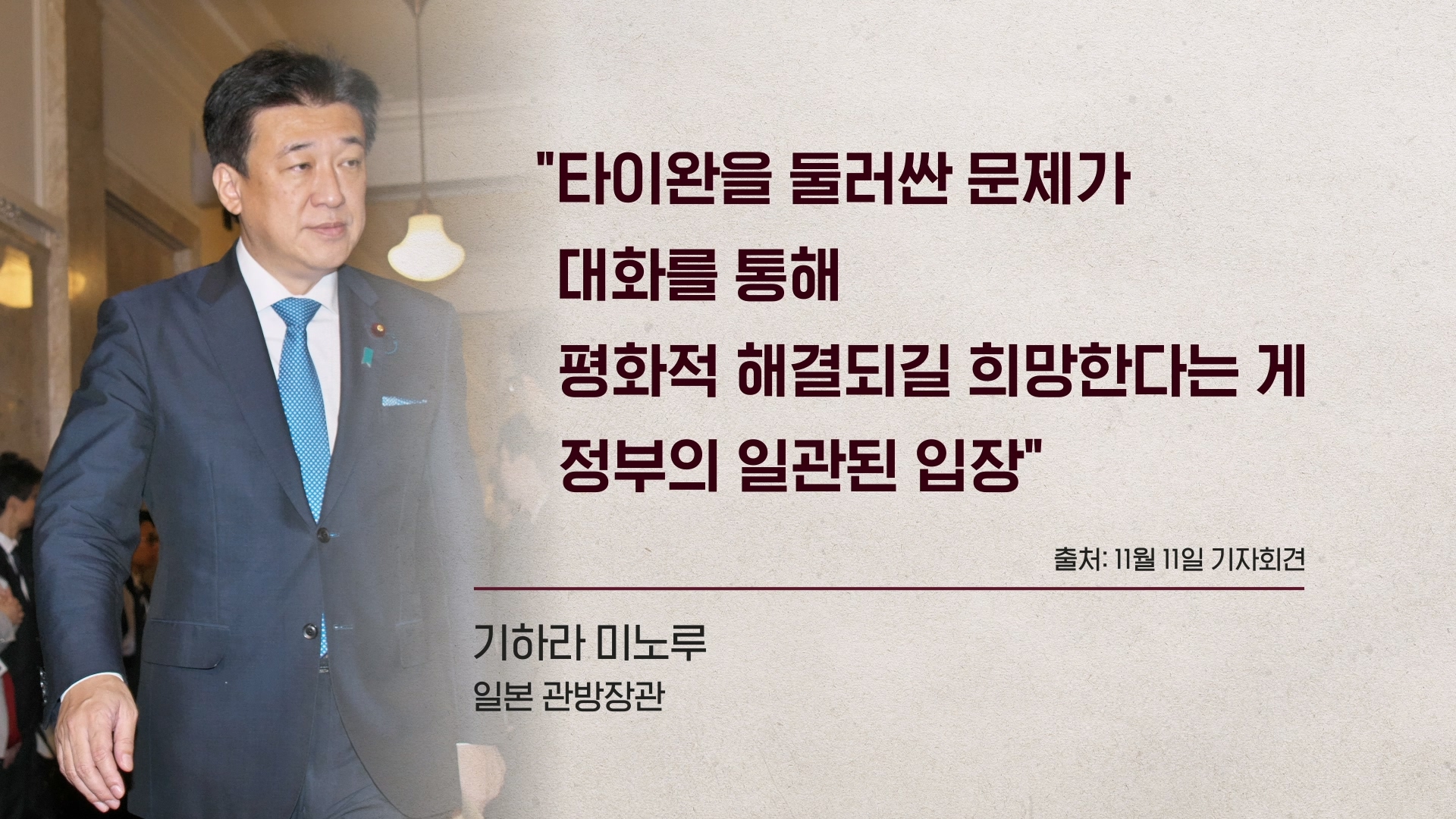 이러한 일련의 상황에 대해 일본 정부는 우선 쉐젠 총영사의 발언이 매우 부적절했다고 강력히 비판하는 한편, 다카이치 총리의 발언과 관련해서는 상황이 더 이상 악화가 되지 않도록 타이완을 둘러싼 문제가 대화를 통해서 평화적으로 해결되길 희망한다는 게 일본 정부의 일관된 입장이다, 이러한 원칙적인 입장을 강조하면서 신중한 태도를 보였습니다.