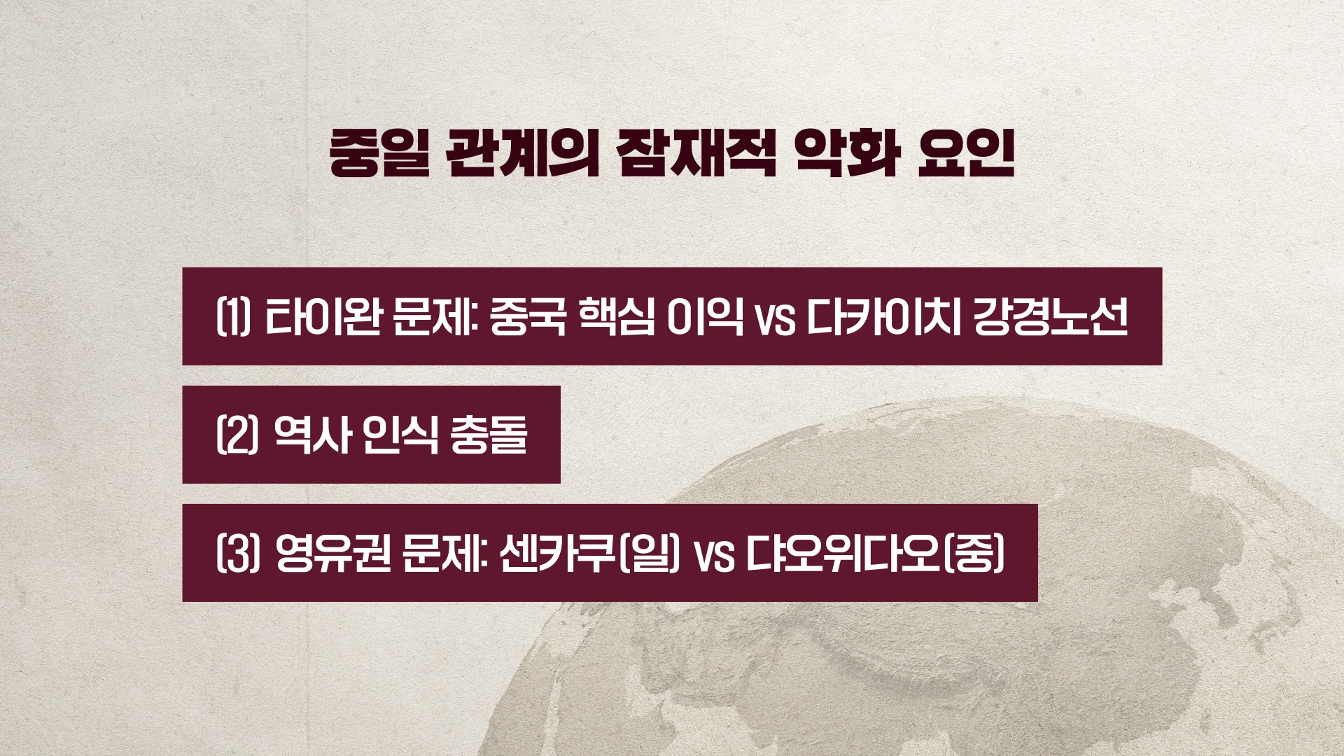 크게 세 가지입니다. 첫째 중국이 핵심 이익으로 삼는 타이완 문제에서 다카이치 총리가 이전부터 일관된 강경 행보를 보였다는 점, 둘째 다카이치 총리가 보이는 수정주의적 역사관 그리고 시진핑 주석이 2012년 집권 이후에 보여온 반제국주의 역사 인식이 근본적으로 충돌할 수밖에 없다는 점, 셋째 일본은 센카쿠 열도라고 부르고 중국은 댜오위다오라고 부르는 영토의 영유권 등을 둘러싼 대립입니다. 하나씩 살펴보겠습니다.