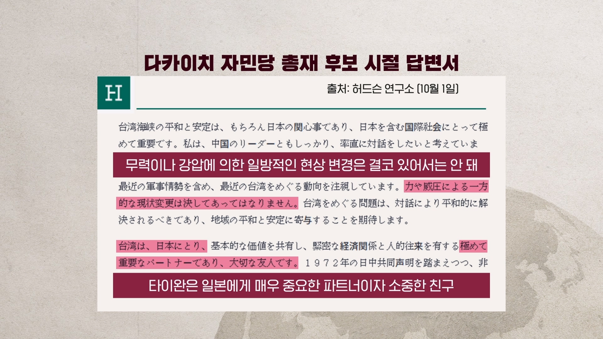 자민당 총재 선거를 앞두고 다카이치 당시 후보가 미국 싱크탱크 허드슨 연구소에 제출한 일본 외교 정책에 관한 글이 있는데요. 타이완 문제에 관한 생각을 묻는 질문에 무려 세 문단에 걸쳐서 "무력이나 강압에 의한 일방적인 현상 변경은 결코 있어선 안 된다" 그리고 "타이완은 일본에게 매우 중요한 파트너이자 소중한 친구이다"라고 강조를 했습니다.