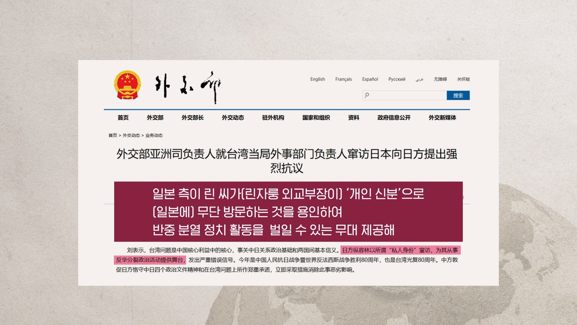 올해 4월에는 국회의원 신분으로 타이완을 방문해서 라이칭더 총통을 만났고요. 또 올해 7월에는 일본을 방문한 타이완의 린자룽 외교부장을 만났습니다.