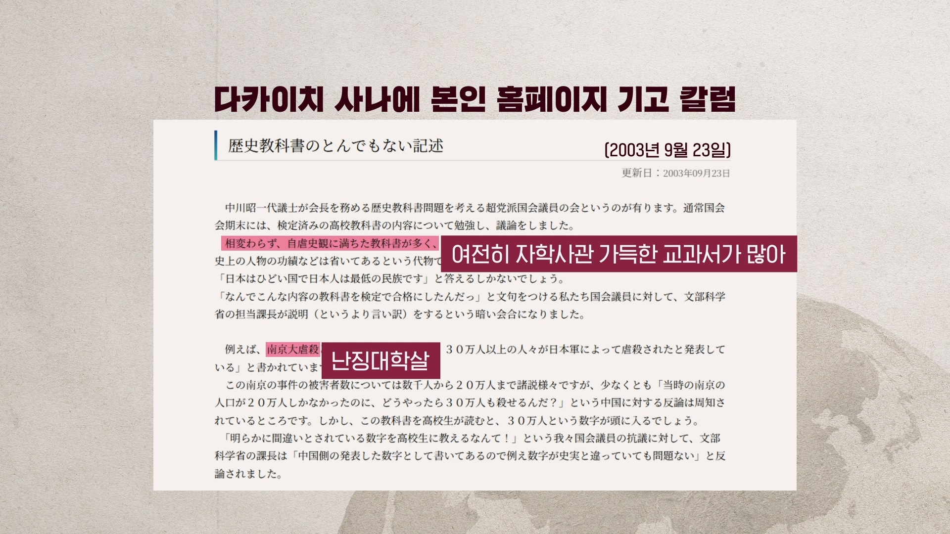20년도 더 전에 다카이치 총리는 본인 홈페이지에서 일본에 "자학사관이 가득한 교과서"가 많다고 지적을 하면서 그 예시로 난징대학살을 들었습니다.