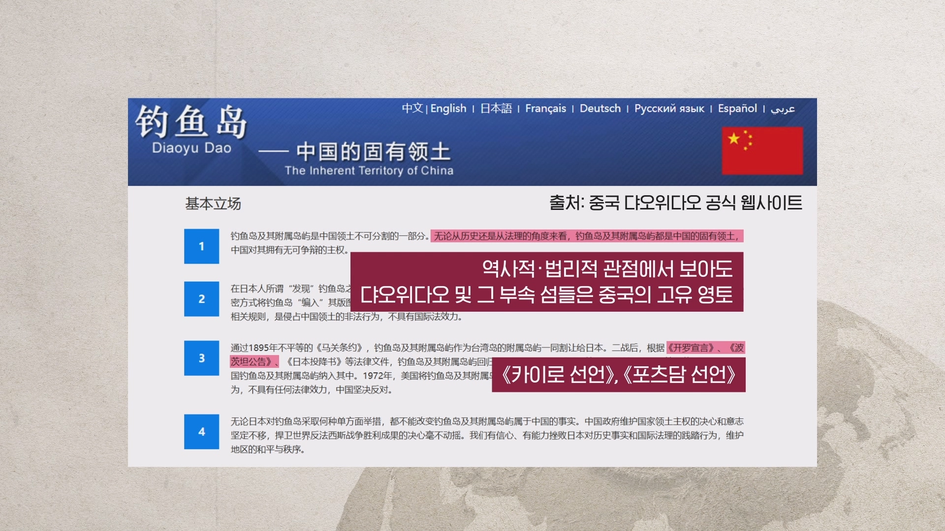 지금 보시는 건 중국 정부가 댜오위다오 공식 웹사이트에 올린 기본 입장인데요. "역사적·법리적 관점에서 보아도 댜오위다오 및 그 부속 섬들은 중국의 고유 영토"다라고 설명합니다. 그리고 열도가 중국에 귀속이 되었다는 근거로 카이로 선언과 포츠담 선언 등을 들었고요.