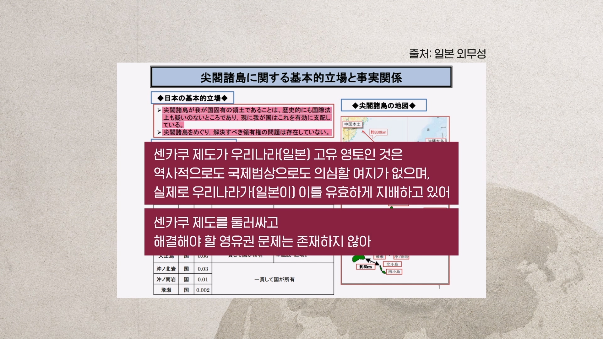 그리고 지금 보시는 건 일본 외무성의 공식 자료입니다. "센카쿠 제도가 일본 고유의 영토라는 건 역사적으로도 국제법상으로도 의심할 여지가 없는 것이며, 실제로 일본은 이것을 유효하게 지배하고 있다"라고 하면서 해결해야 할 영유권 문제 자체가 존재하지 않는다는 입장을 유지하고 있습니다.