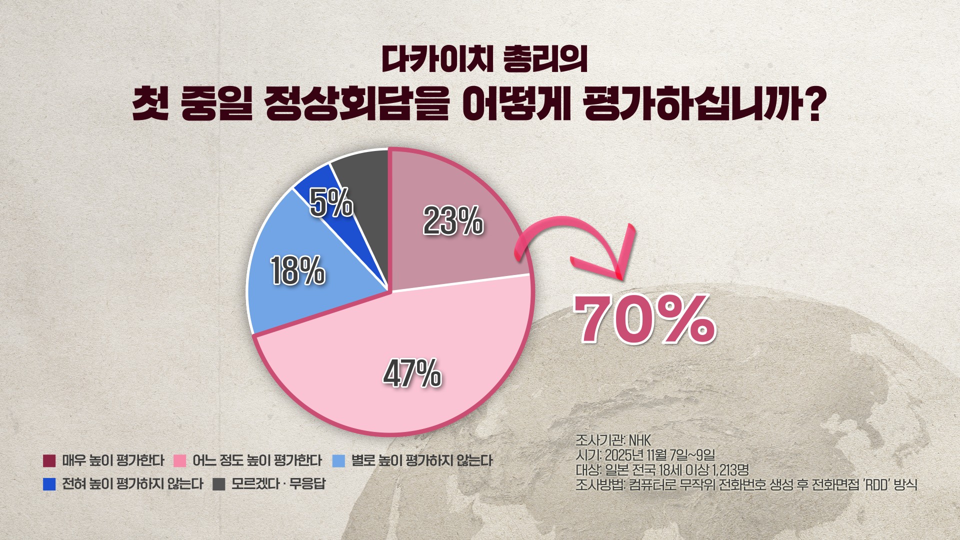 그 이후인 11월 7일부터 9일까지 일본 국민 1,213명을 대상으로 NHK가 진행한 여론조사를 보시면요. 다카이치 총리의 중일 정상회담에 대한 부정 평가는 약 23%였지만, 긍정 평가만 놓고 보면 약 70%에 이릅니다.