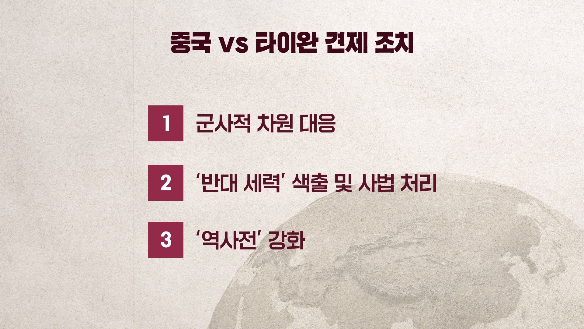 저희가 최근 중국과 타이완 당국 각각의 조치를 첫째, 군사적 차원의 대응, 둘째, '반대 세력' 색출 및 사법 처리, 그리고 셋째, '역사전' 강화, 이렇게 세 갈래로 정리해봤습니다.