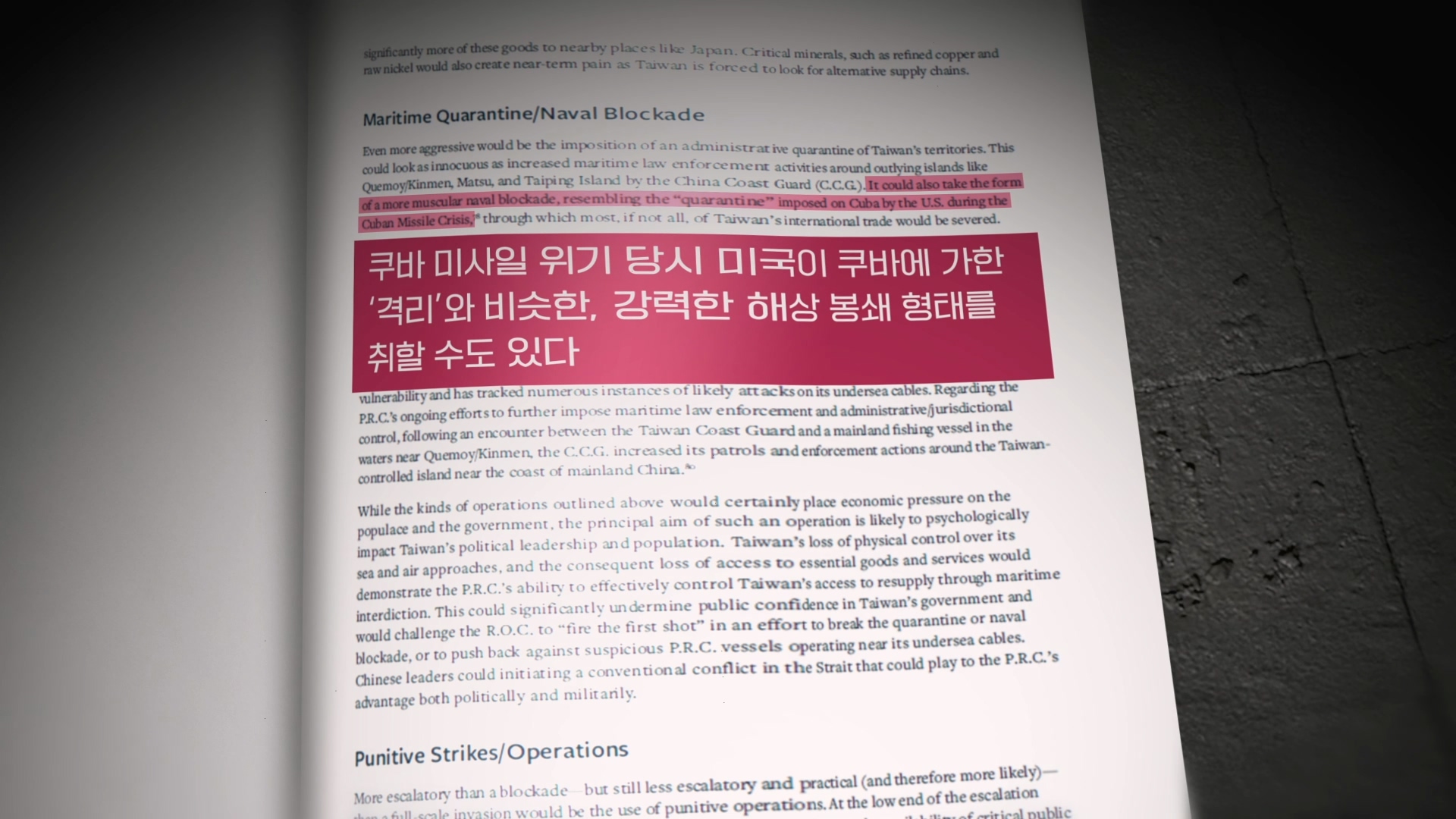 이러한 일련의 중국의 군사적인 움직임과 관련해서 최근 스팀슨센터의 연구 보고서에 따르면, 전면 침공과 같은 시나리오보다는 다음과 같은 시나리오가 더 현실성이 있다라는 취지로 결과를 냈는데요.