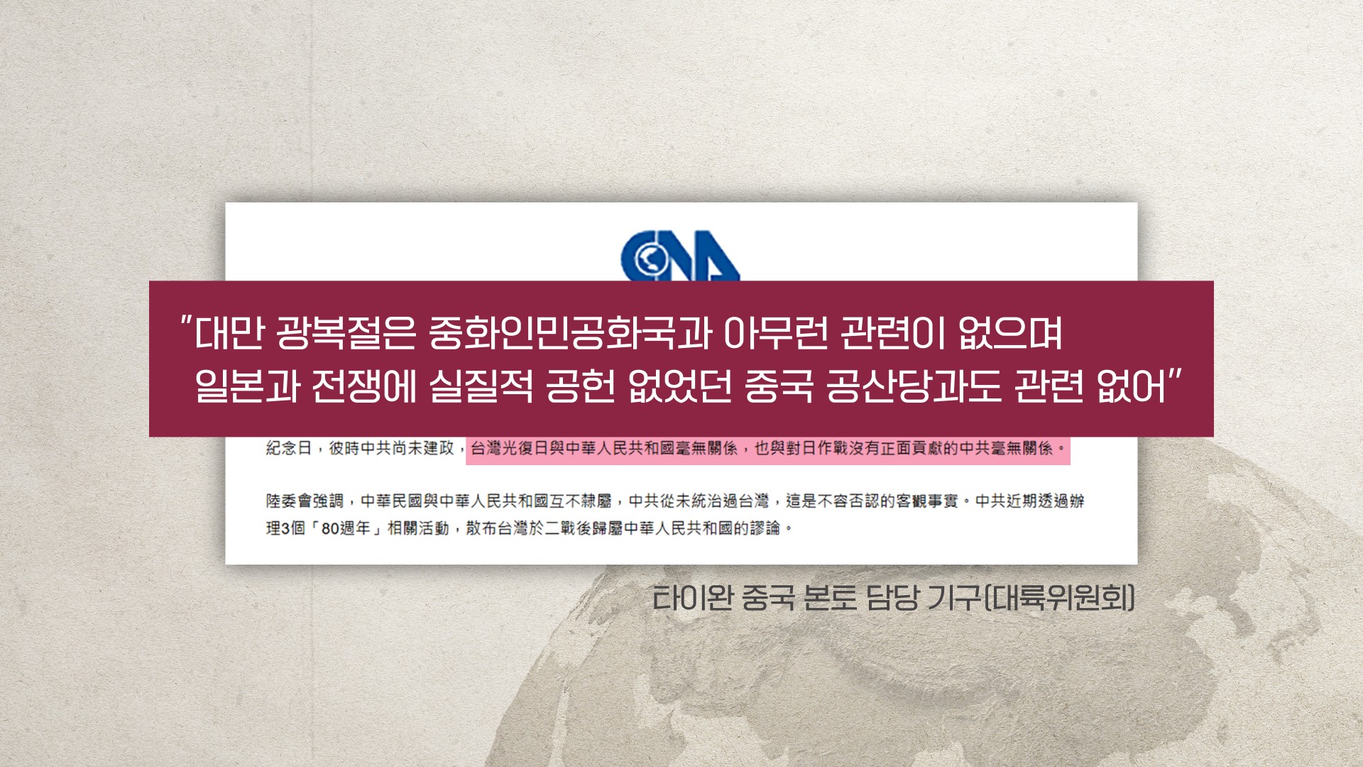 다음은 '역사전' 강화입니다. 중국은 이른바 '역사전'도 강화하고 있는데요. 지난달 처음으로 10월 25일을 타이완 광복 기념일로 공식 제정하고 기념식을 열었습니다.