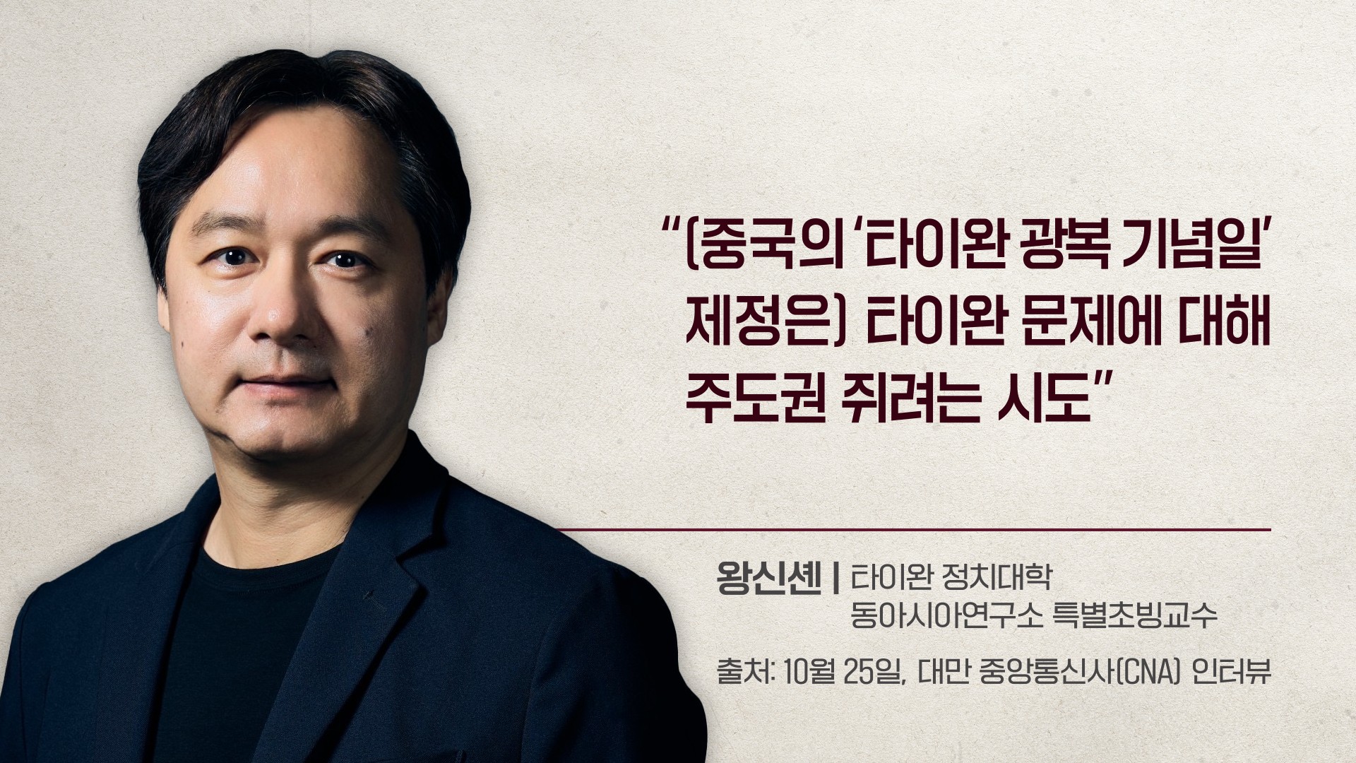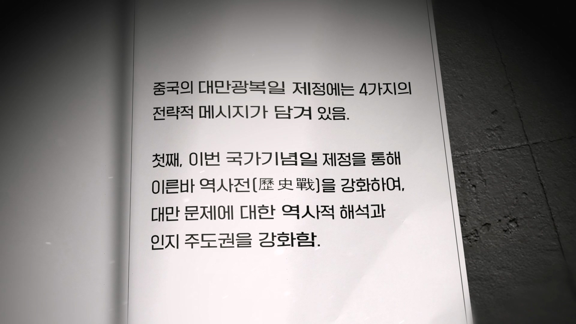 국가안보전략연구원의 분석에 따르면요. 이러한 중국의 타이완 광복 기념일 제정에는 이른바 역사전을 강화해서 타이완 문제에 대한 역사적인 해석과 또 인지 주도권을 강화하겠다는 의도 등의 전략적 메시지가 담겨 있다, 이렇게 분석을 했습니다.