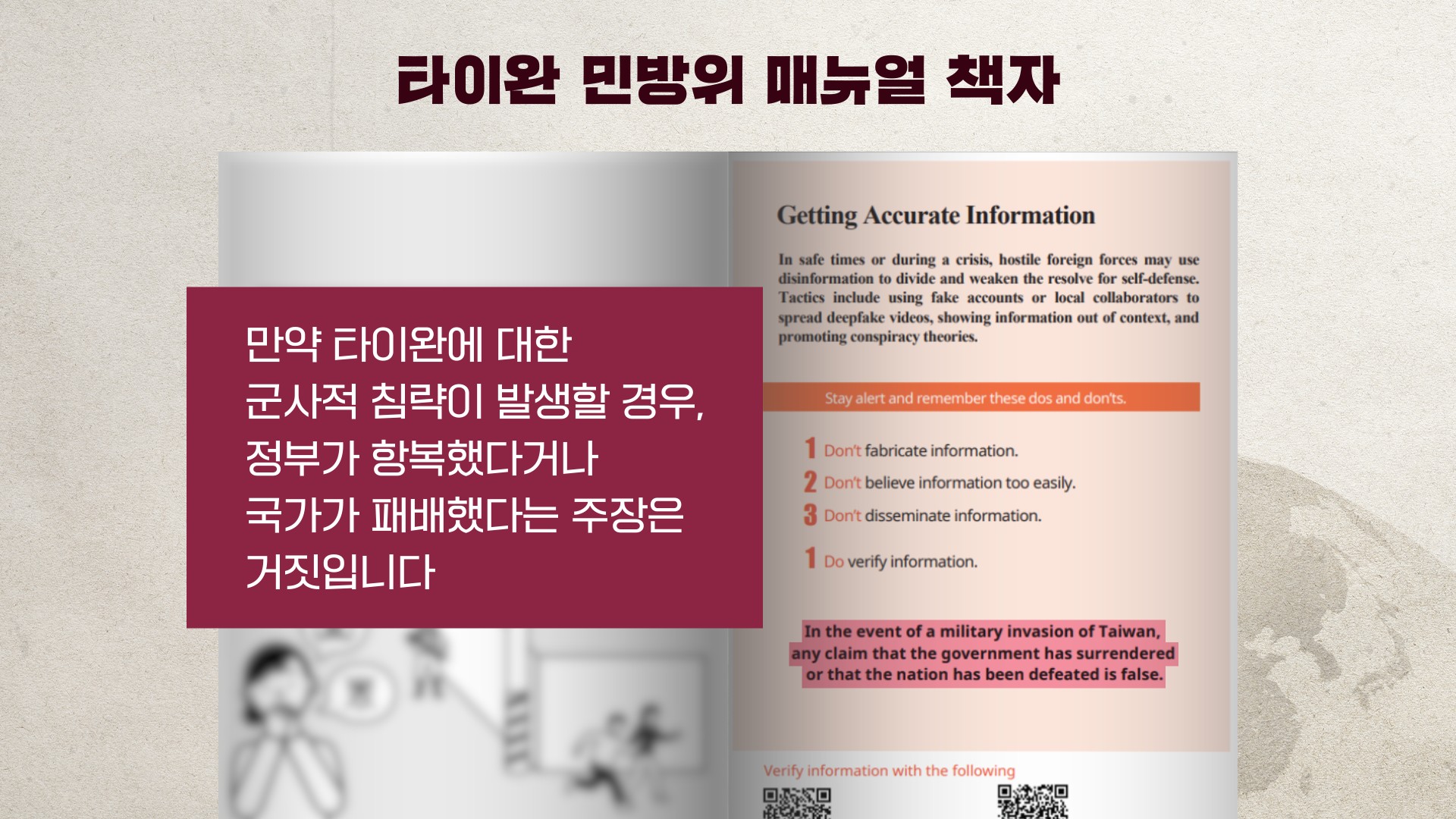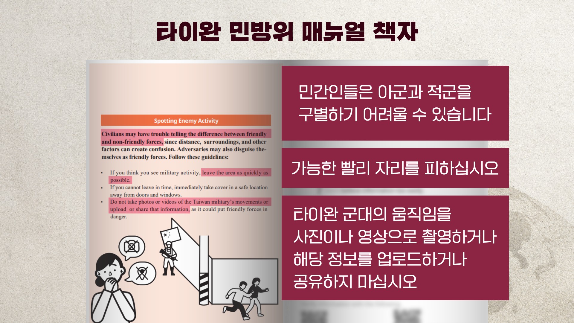 적군을 발견했을 때에는 시민들이 아군과 적군을 정확히 구별하기가 어렵기 때문에 가능한 빨리 자리를 피해라, 그리고 타이완 군인의 움직임을 사진이나 영상으로 촬영하거나 이를 공유하지 말아라, 이런 안내도 담겼습니다.