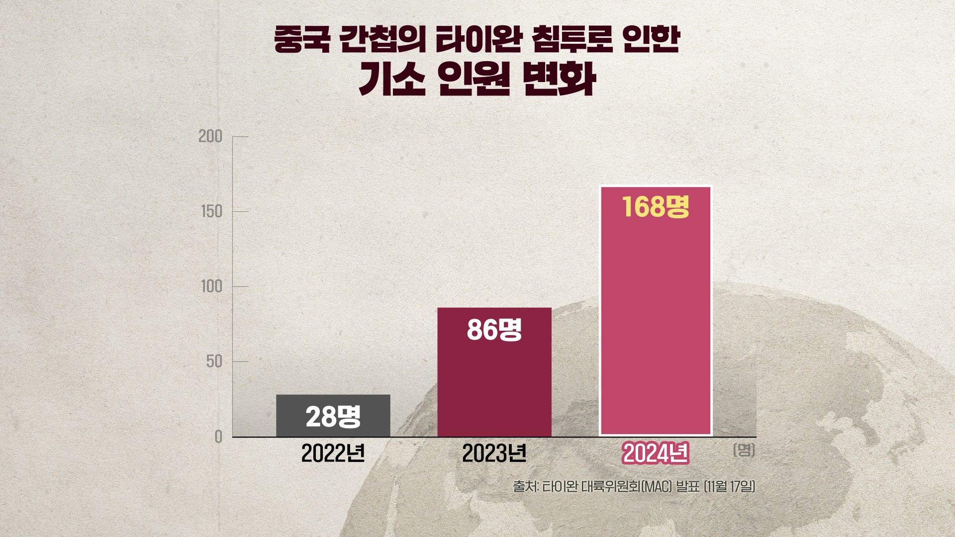 타이완의 중국 본토 담당 기구(대륙위원회)의 지난 17일 발표에 따르면요. 중국 간첩의 타이완 침투 행위로 인해서 기소가 된 인원은 보시다시피 이렇게 급증했습니다. 지난 한 해에만 168명이었습니다.