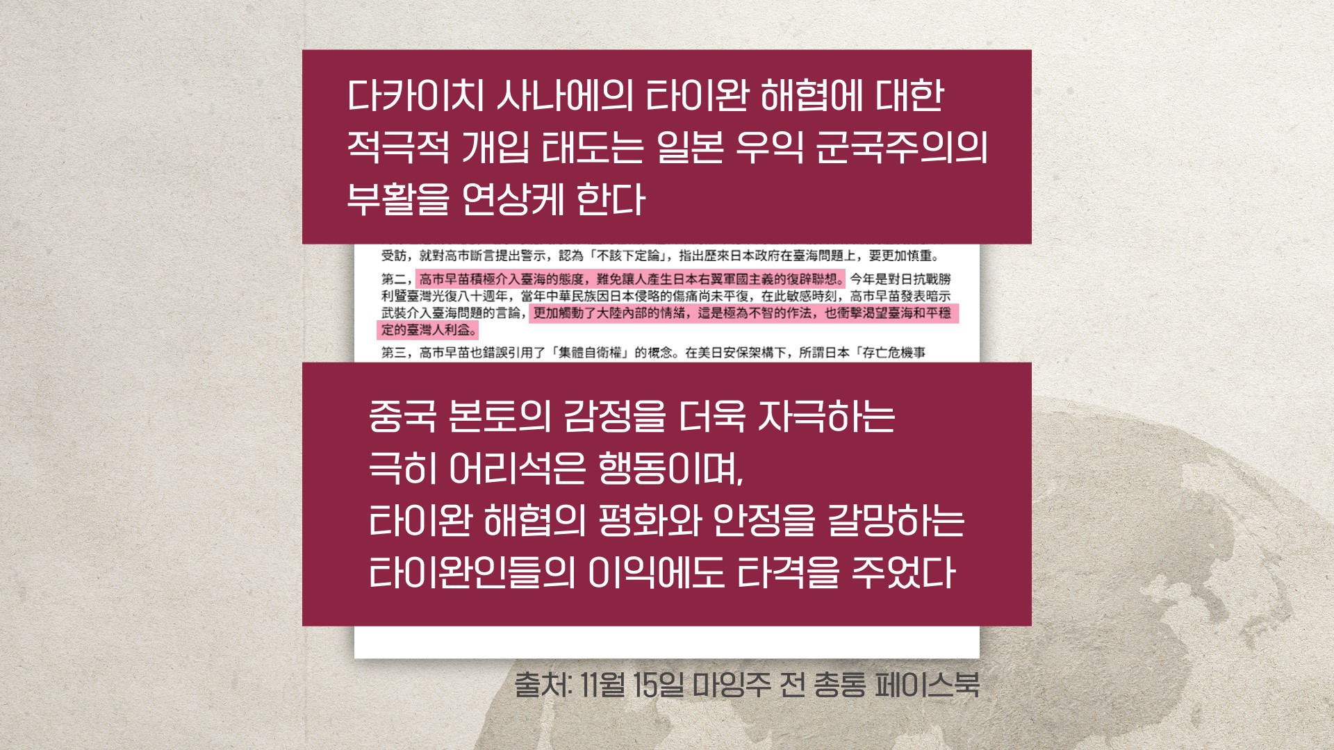타이완 제1야당인 중국 국민당 소속인 마잉주 전 총통은 친중 성향으로 분류되기도 하는데, '다카이치 사나에의 태도는 일본 우익 군국주의의 부활을 연상케 한다', '중국 본토의 감정을 더 자극하는 극히 어리석은 행동이며, 타이완 해협의 평화와 안정을 갈망하는 타이완인들의 이익에도 타격을 줬다'라고 했습니다.