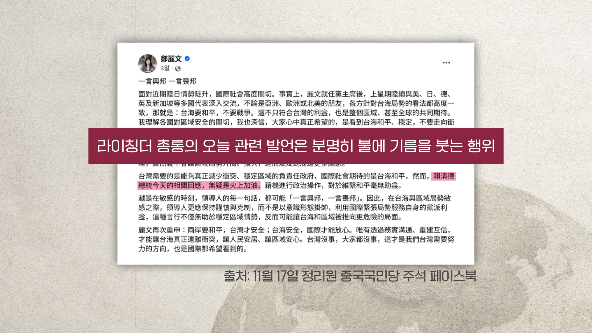 같은 제1야당 중국국민당의 정리원 주석은 라이칭더 총통의 발언이 '분명히 불에 기름을 붓는 행위다'라고 비판을 했고요. 다카이치 총리의 발언도 부적절했다는 취지로 입장을 폈습니다.