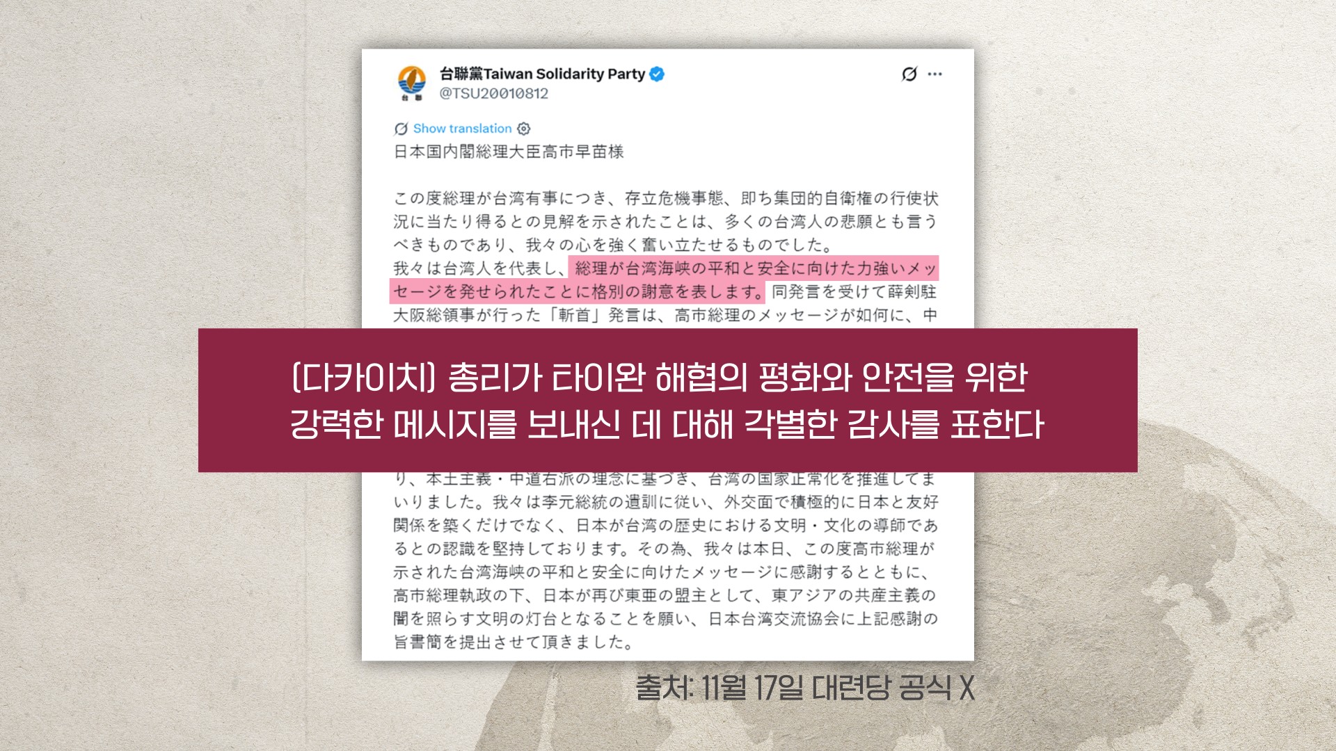반면 독립 성향 정당인 대련당은 다카이치 총리에게 보내는 일본어로 된 편지를 X에 게시를 했는데요. '다카이치 총리가 강력한 메시지를 보낸 데 대해 각별한 감사를 표한다'라고 하면서 지지를 밝혔습니다.