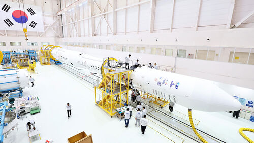 ▲ 고흥 나로우주센터 조립동에서 연구진들이 누리호 4차 발사 총조립을 수행하는 모습