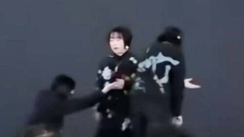 잠시 뒤 스태프로 추정되는 두 사람이 가수에게 다가가 무언가를 얘기하며 마이크를 가져가 버립니다.