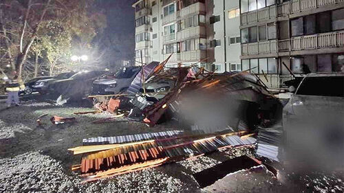 오늘(1일) 오전 2시 53분 강원 속초시 교동 한 아파트 주차장에 지붕 구조물이 날아들어 차량 6대가 부서졌습니다.