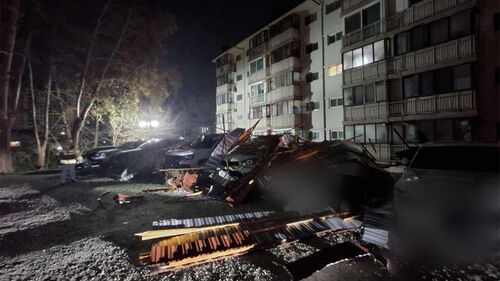 오늘(1일) 강원특별자치도소방본부에 따르면 오늘 오전 2시 53분 속초시 교동 한 아파트 주차장에 지붕 구조물이 날아들어 차량 6대가 부서졌습니다.