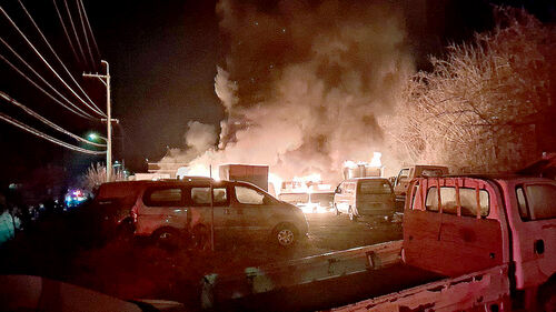 ▲ 7일 오전 5시 52분쯤 경북 성주군 공터에서 원인이 밝혀지지 않은 화재가 발생했다. 이 사고로 차량 12대가 불에 탔다.