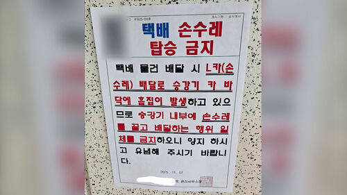 한 아파트에서 택배 손수레는 엘리베이터에 타지 못하게 하는 공지를 내걸었는데요.