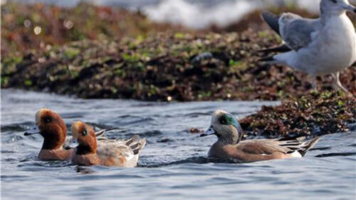 이곳 아메리카홍머리오리는 홍머리오리 10여 마리와 함께 기죽지 않고 어울리며 바위 주변의 해초를 뜯어 먹는 먹이활동에 열중하거나 한가로이 유영하며 씩씩하게 지내는 모습으로 관찰되고 있습니다.