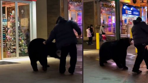 그런데 갑자기 한 남성이 곰의 뒤를 따라와선 툭하고 건드립니다.