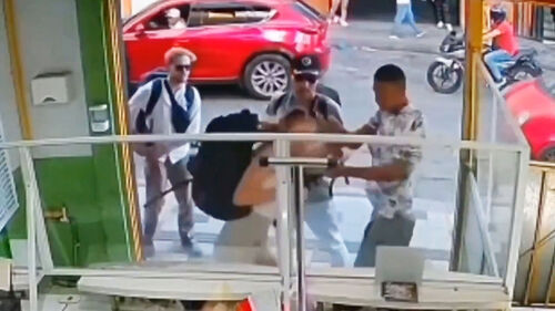 젊은 여행객 두 명이 이야기를 나누고 있는데 갑자기 흉기를 든 강도가 나타납니다.