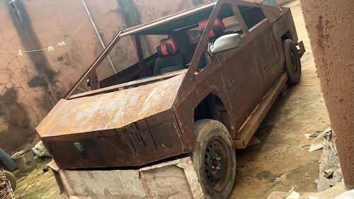 특유의 각진 외관은 테슬라의 사이버 트럭 그대로지만, 전체적으로 뻘겋게 녹슨 모습이 좀 이상하죠.