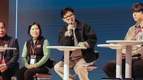 ▲ 국민의힘 한동훈 전 대표가 21일 경기도 고양시 킨텍스에서 연 토크콘서트에서 참가자들과 대화하고 있다.