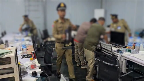 컴퓨터 장비들이 놓인 사무실 안을 캄보디아 경찰이 수색합니다.