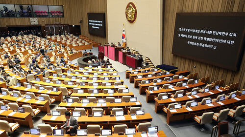 ▲ 23일 국회에서 열린 12월 임시국회 본회의에서 12·3 윤석열 비상계엄 등에 대한 전담재판부 설치 및 제보자 보호 등에 관한 특별법에 대한 무제한 토론 종결 동의의 건 투표가 시작되자 퇴장한 국민의힘 의원들로 인해 의원석이 비어 있다.