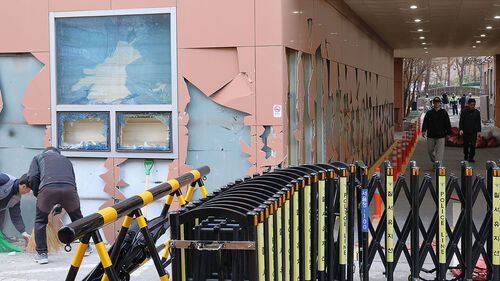 ▲ 불법 폭력 사태로 파손된 서부지법에서 지난 1월 19일 오후 청사 관계자들이 복구 작업을 하는 모습