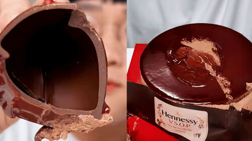 꼬냑 병을 형상화한 초콜릿 장식이 케이크 위에 올라가 있습니다.