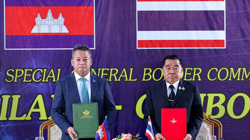 ▲ 현지 시간 27일 태국 찬타부리주에서 나따폰 낙파닛 태국 국방부 장관(오른쪽)과 띠어 세이하 캄보디아 국방부 장관이 회담 후 휴전 합의서를 들어보이고 있다.