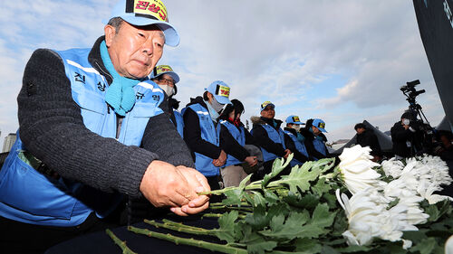 ▲ 12·29 제주항공 여객기 참사 1주기를 이틀 앞둔 27일 오후 광주 동구 5·18 민주광장에서 열린 1주기 광주·전남 추모대회에서 유가족들이 헌화하고 있다.
