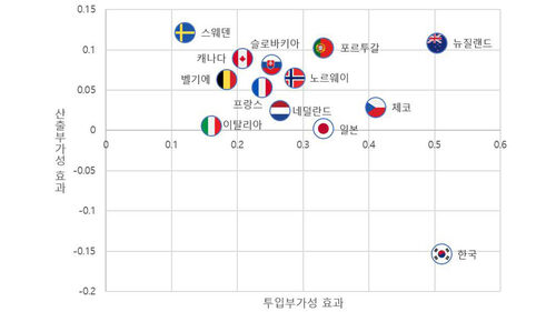 그 결과 한국의 경우 기업에 직접지원했을 때 투입 부가성이 주요국 중 가장 높은 수준으로 나타난 반면 산출 부가성은 가장 낮은 것으로 나타났습니다.