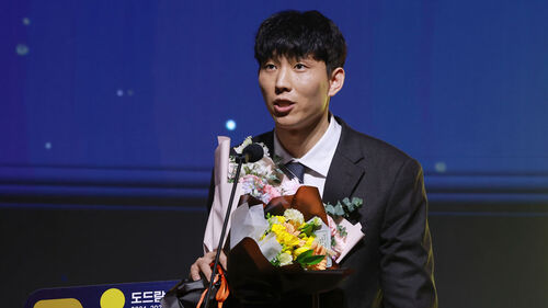 ▲ 프로배구 2024-2025 V리그 시상식에서 남자부 베스트 7에 선정된 세터 KB손해보험 황택의가 소감을 밝히고 있다.