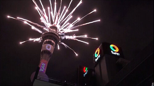오클랜드의 328미터 높이 스카이타워에서 쏘아 올린 3천500발의 불꽃놀이가 밤하늘을 밝혔습니다.